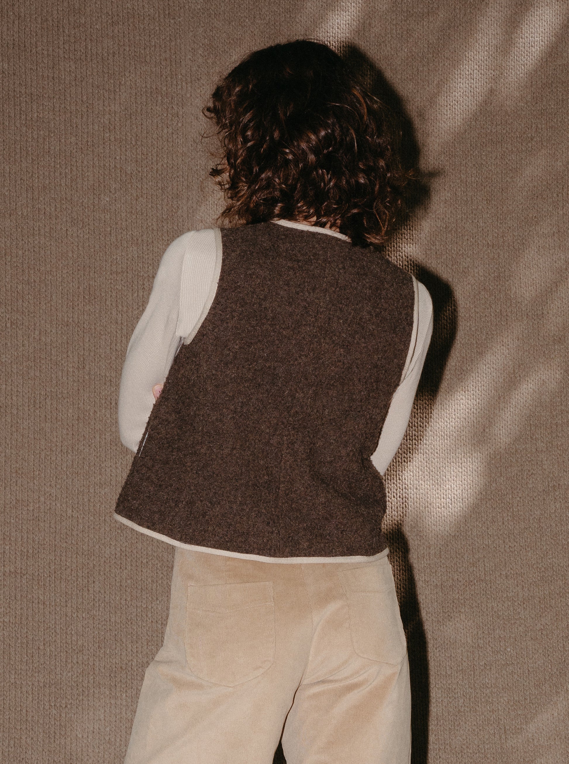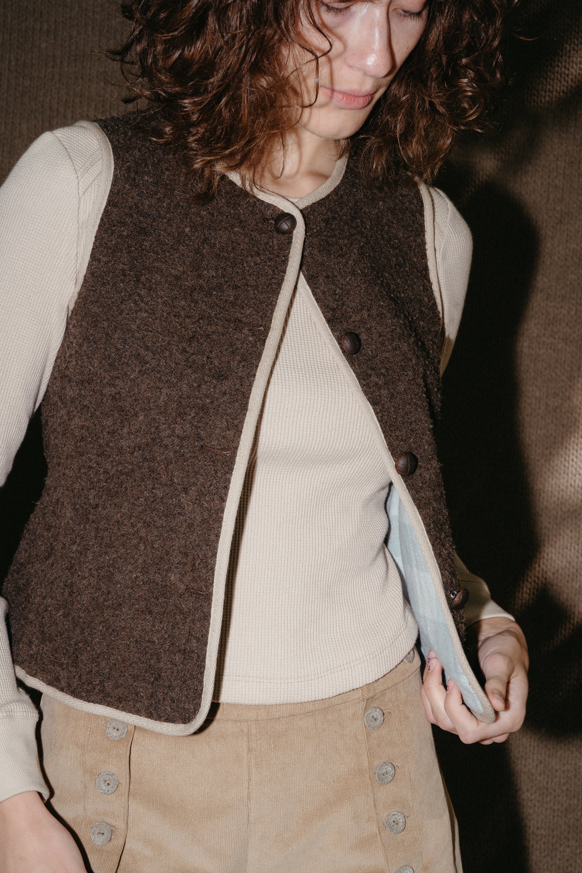 Made from traditional Casentino wool, this vest has a textured, slightly rugged hand that softens with wear. The silhouette is close to the body—cropped and snug, but still easy to layer. A piece with quiet character, it is lined in cozy flannel, finished with contrasting twill binding, and adorned with 1970s vintage leather buttons. Wear it over a shirt or under a coat for added warmth when the temperature dips.