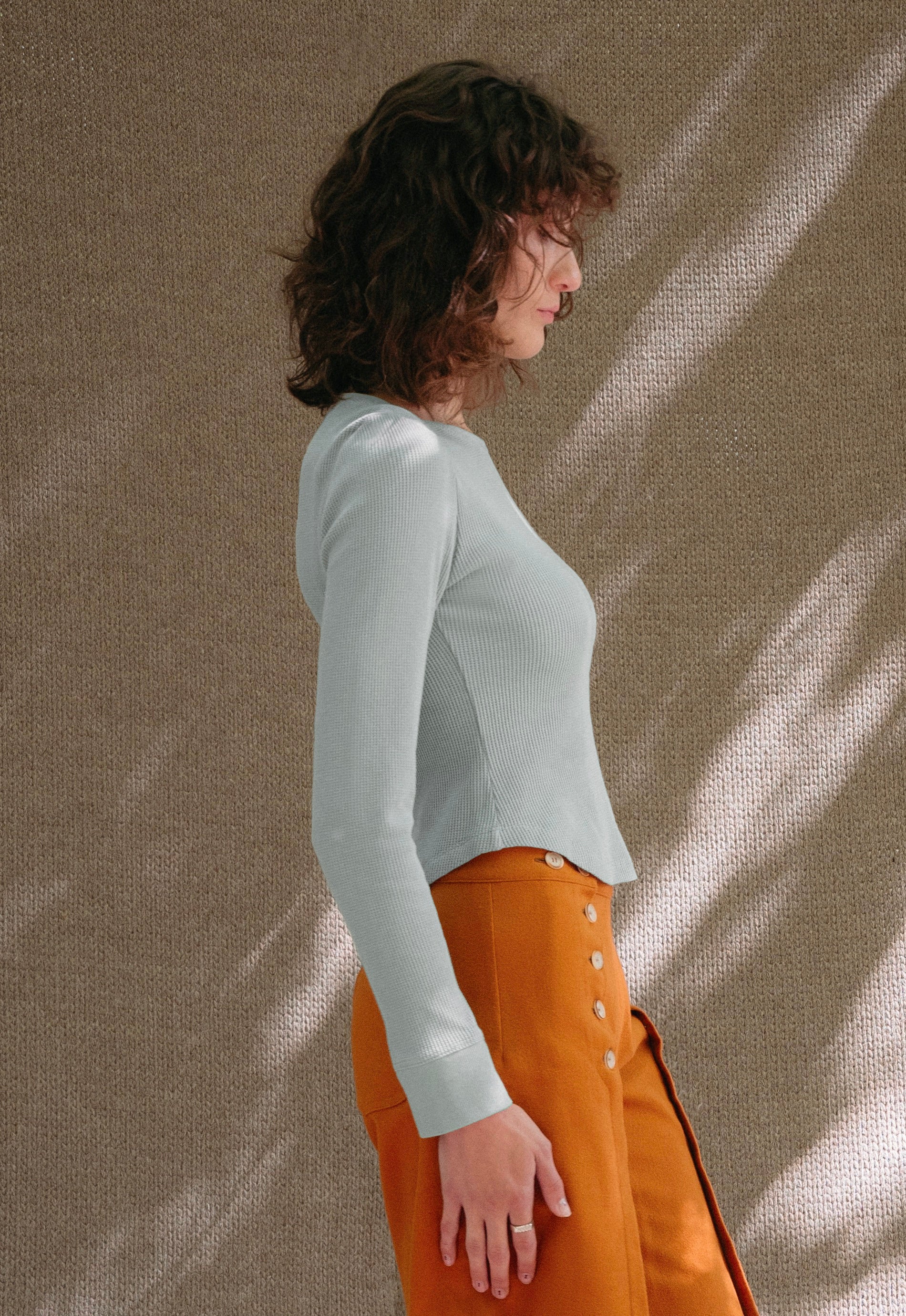 A laid-back layer in a soft, breathable waffle knit. The neckline features a clean overlapping detail—subtle yet distinctive, with a nod to childhood basics. A wardrobe staple made to withstand wear, without ever going out of style.