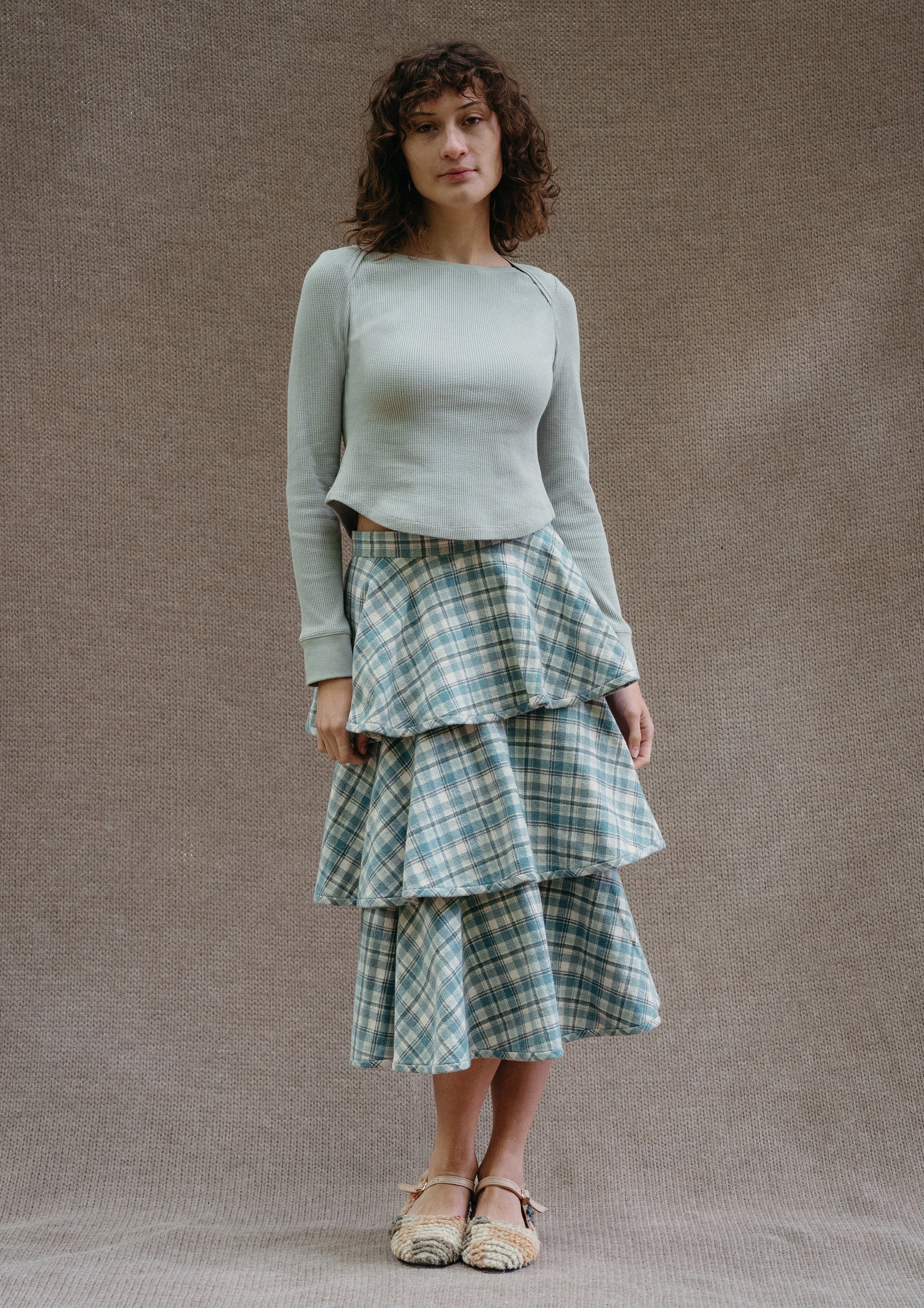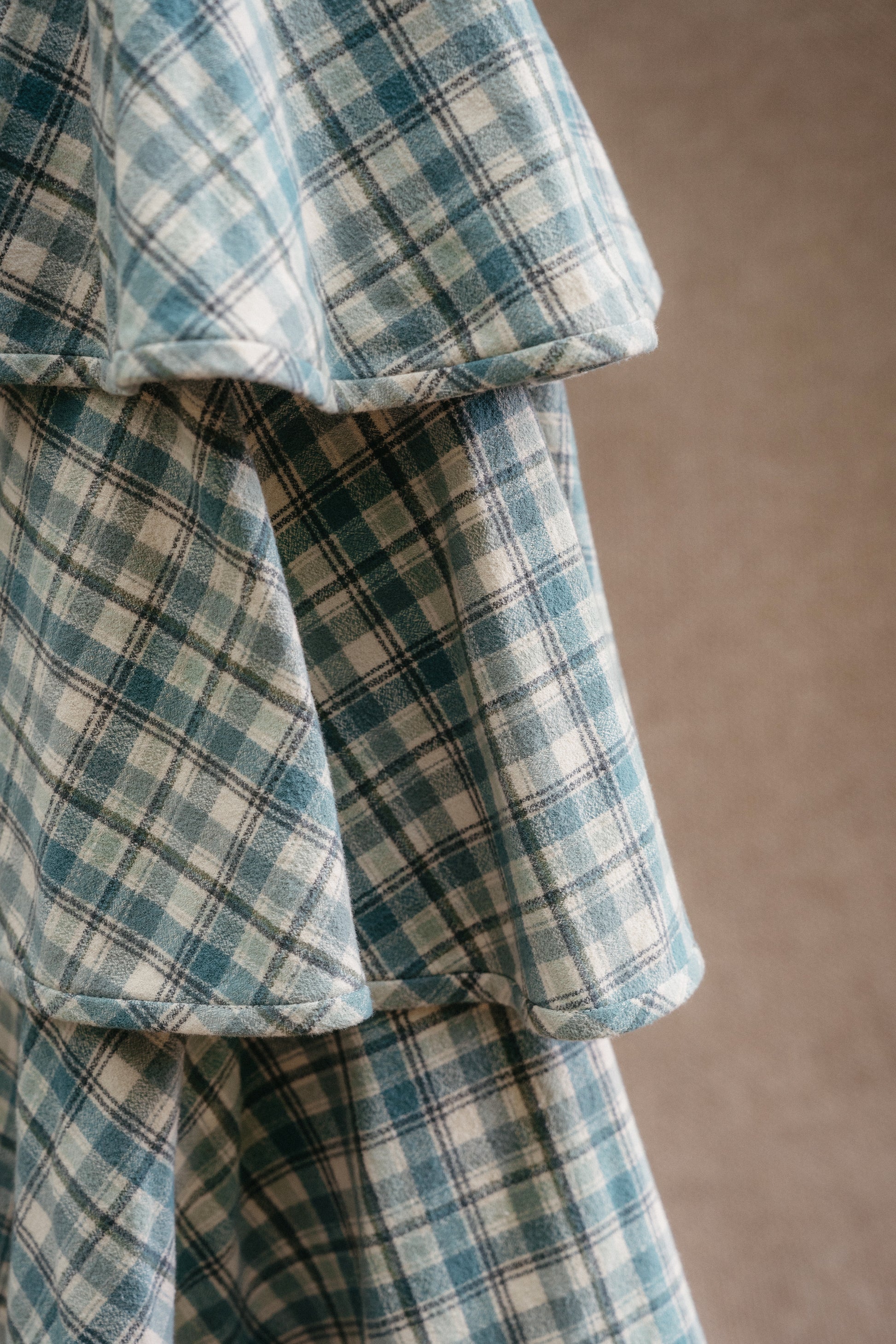 A bold statement in organic flannel, this skirt plays with volume and movement in three generous tiers, each finished with subtle binding. In a rich dusty blue plaid, the skirt offers an unexpected take on flannel—soft, yet full of character.